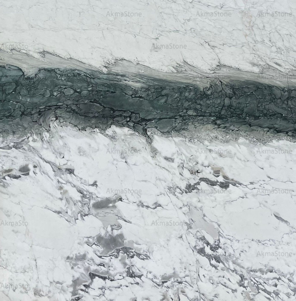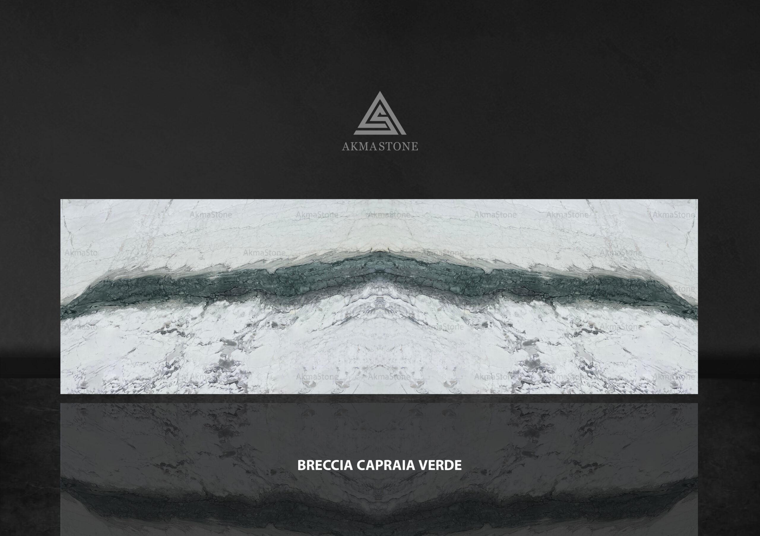 BRECCIA CAPRAIA VERDE is a premium natural stone from Akma Stone, featuring a rich green base with striking beige, white, and golden veining, creating a dramatic and luxurious appearance. Each slab displays a unique breccia pattern, making it perfect for statement pieces in sophisticated interiors.