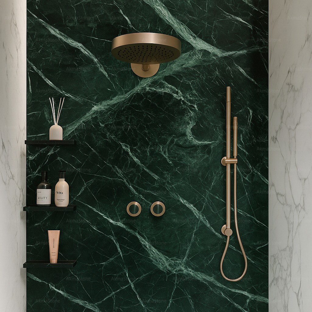 VERDE TINOS MARBLE — vibrant green marble with elegant veining and polished finish, ideal for high-end floors, walls, and countertops.