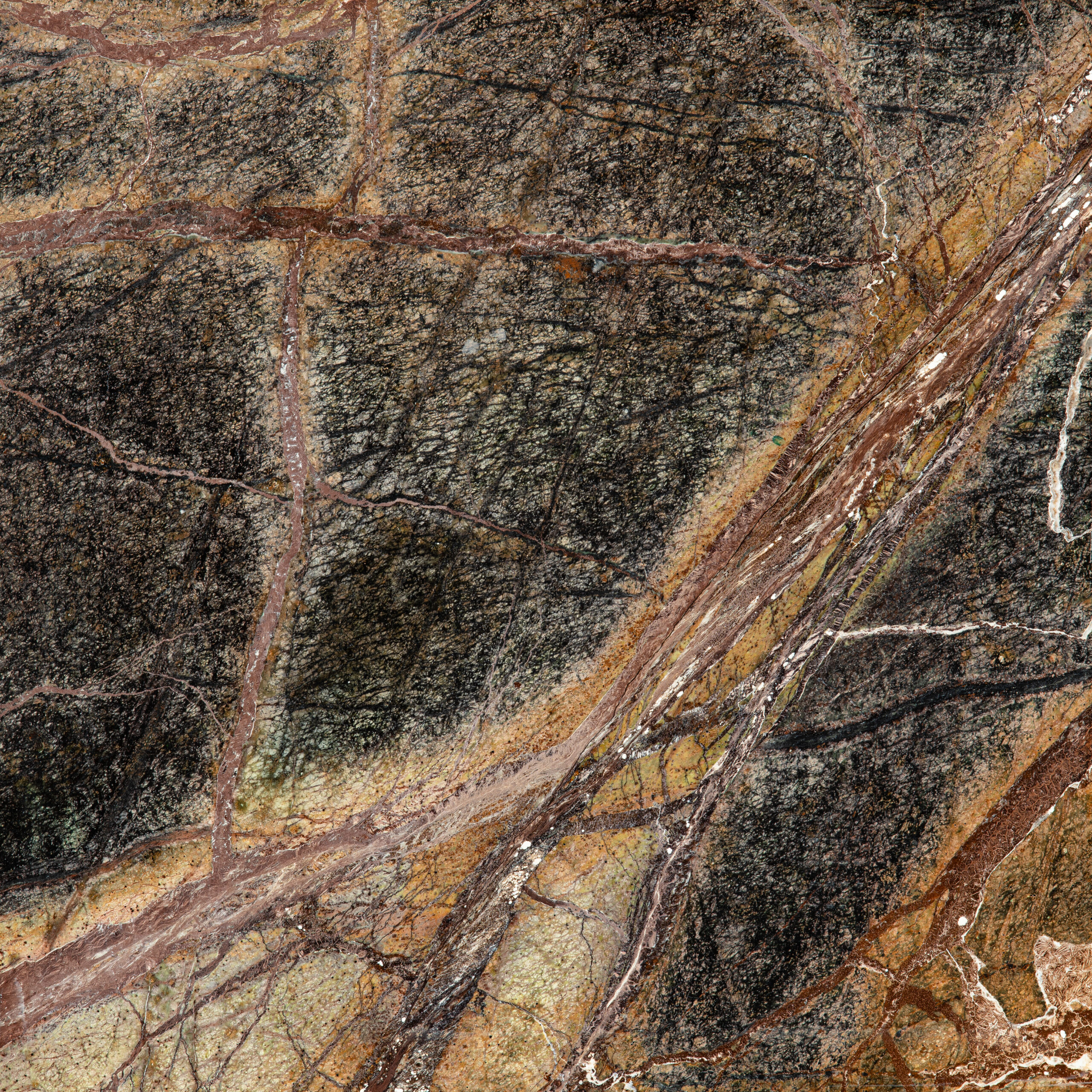 رخام فورست برون بني داكن مع لمسات خضراء وعروق ذهبية، حجر طبيعي فاخر يضفي أناقة وفخامة على المساحات الداخلية.