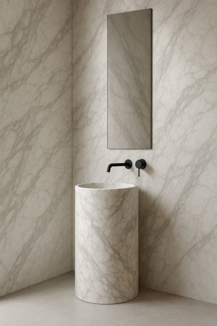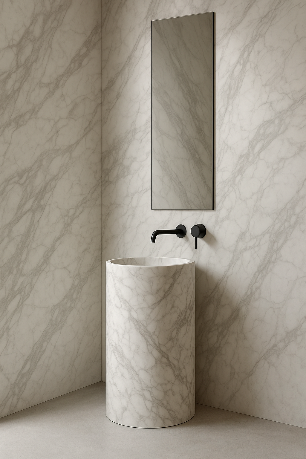 رخام أربسكاتو يوناني بلونه الأبيض وعروقه الرمادية الراقية، خيار مثالي للمساحات التي تبحث عن نقاء بصري وفخامة طبيعية هادئة.