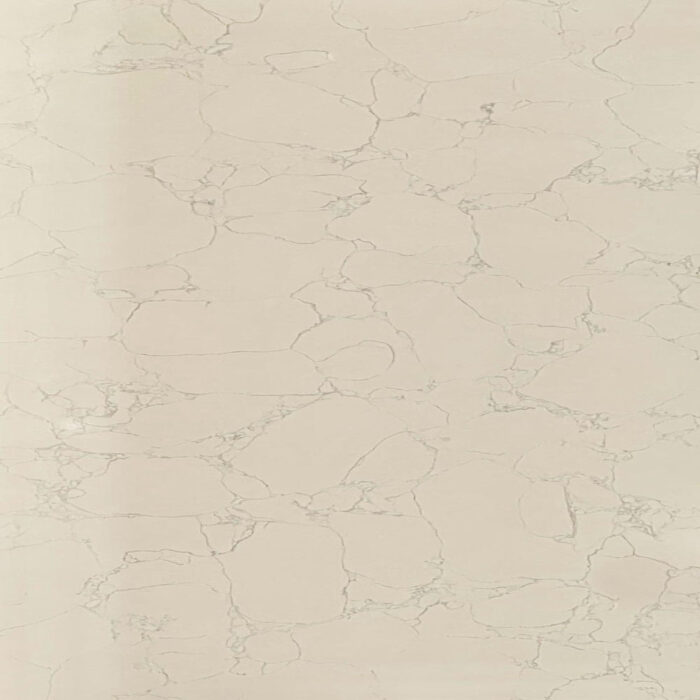 رخام صناعي بلون أبيض مع عروق رمادية ناعمة، يتميز بلمسة مصقولة ومتانة عالية، مثالي للأسطح، الجدران، والأرضيات الفاخرة.