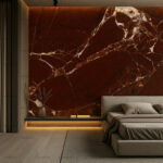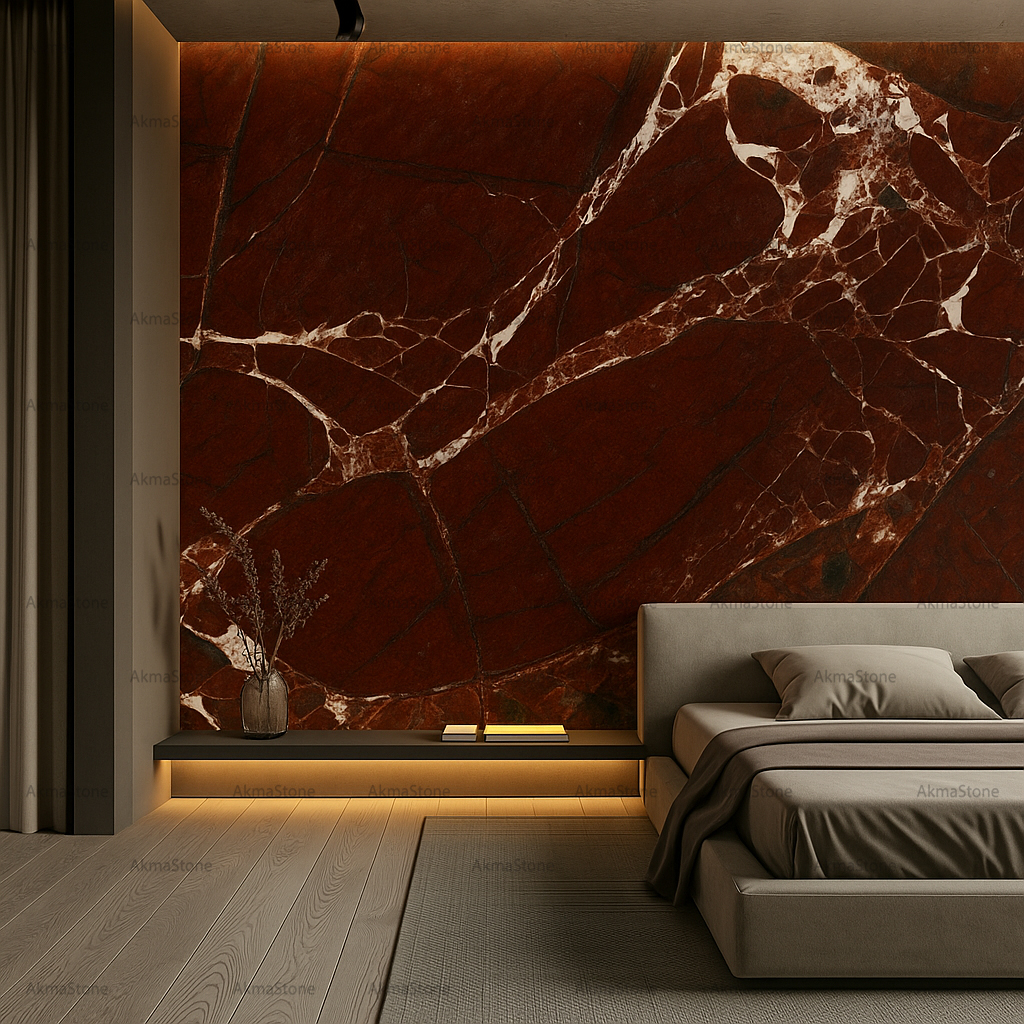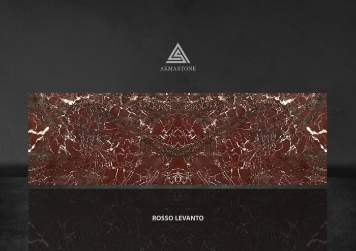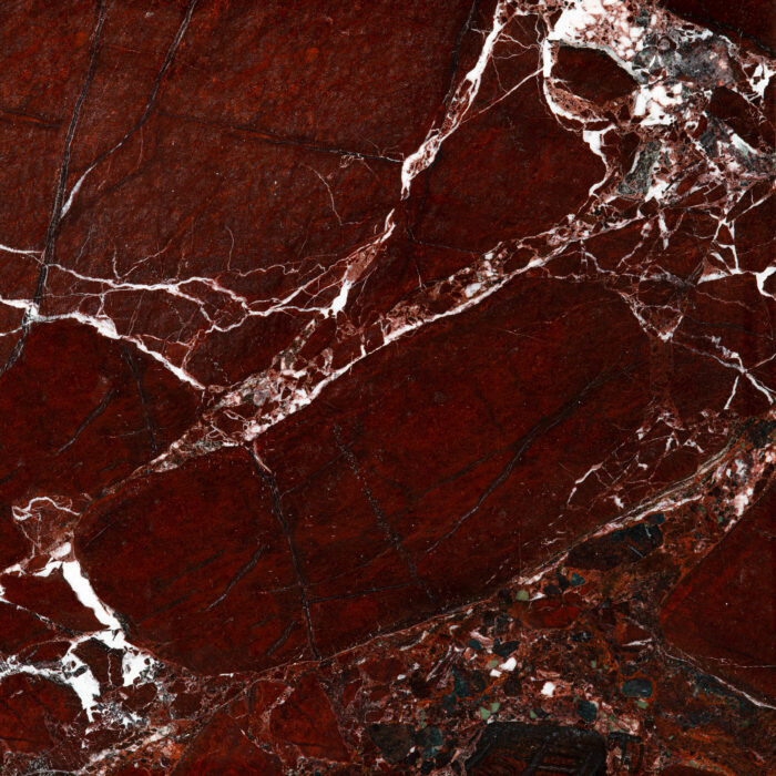 رخام روسو ليفانتو بلونه العنابي الداكن وعروقه البيضاء الجريئة، حجر طبيعي فاخر مثالي للتصاميم الداخلية ذات الطابع القوي والأنيق.