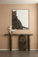 رخام فورست برون هو حجر طبيعي فريد يتميز بلونه البني الغامق المائل إلى الأخضر مع عروق طبيعية دقيقة ومتداخلة بألوان بيج وذهبية، مما يمنحه مظهرًا راقيًا ودافئًا يناسب التصاميم الكلاسيكية والعصرية. يعكس هذا الرخام جمال الطبيعة ويضفي إحساسًا بالأناقة والفخامة على أي مساحة داخلية.