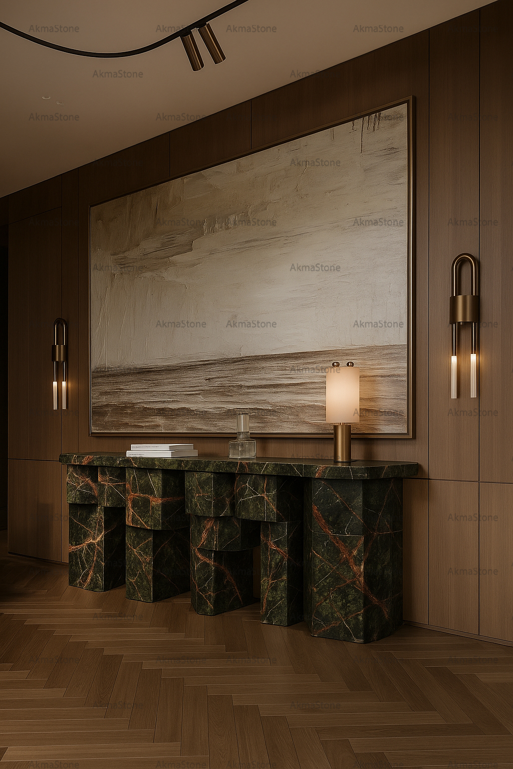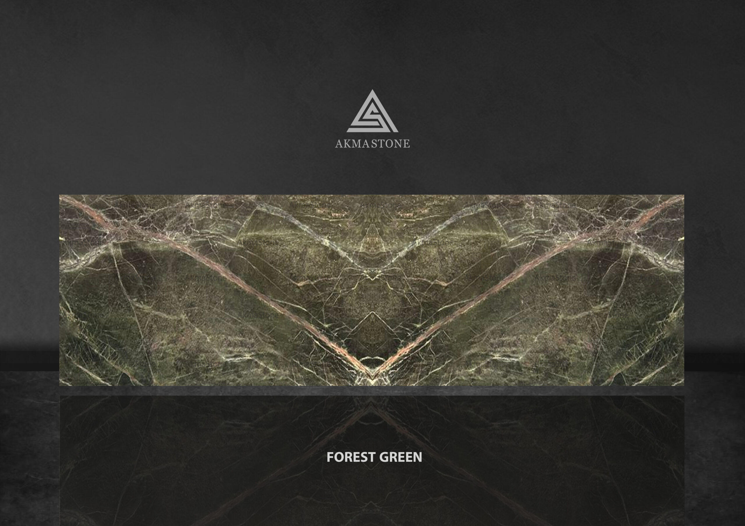 رخام فورست غرين بلونه الأخضر الطبيعي وعروقه الخشبية، حجر طبيعي يجمع بين الجرأة والفخامة في تصاميم مستوحاة من الغابة.