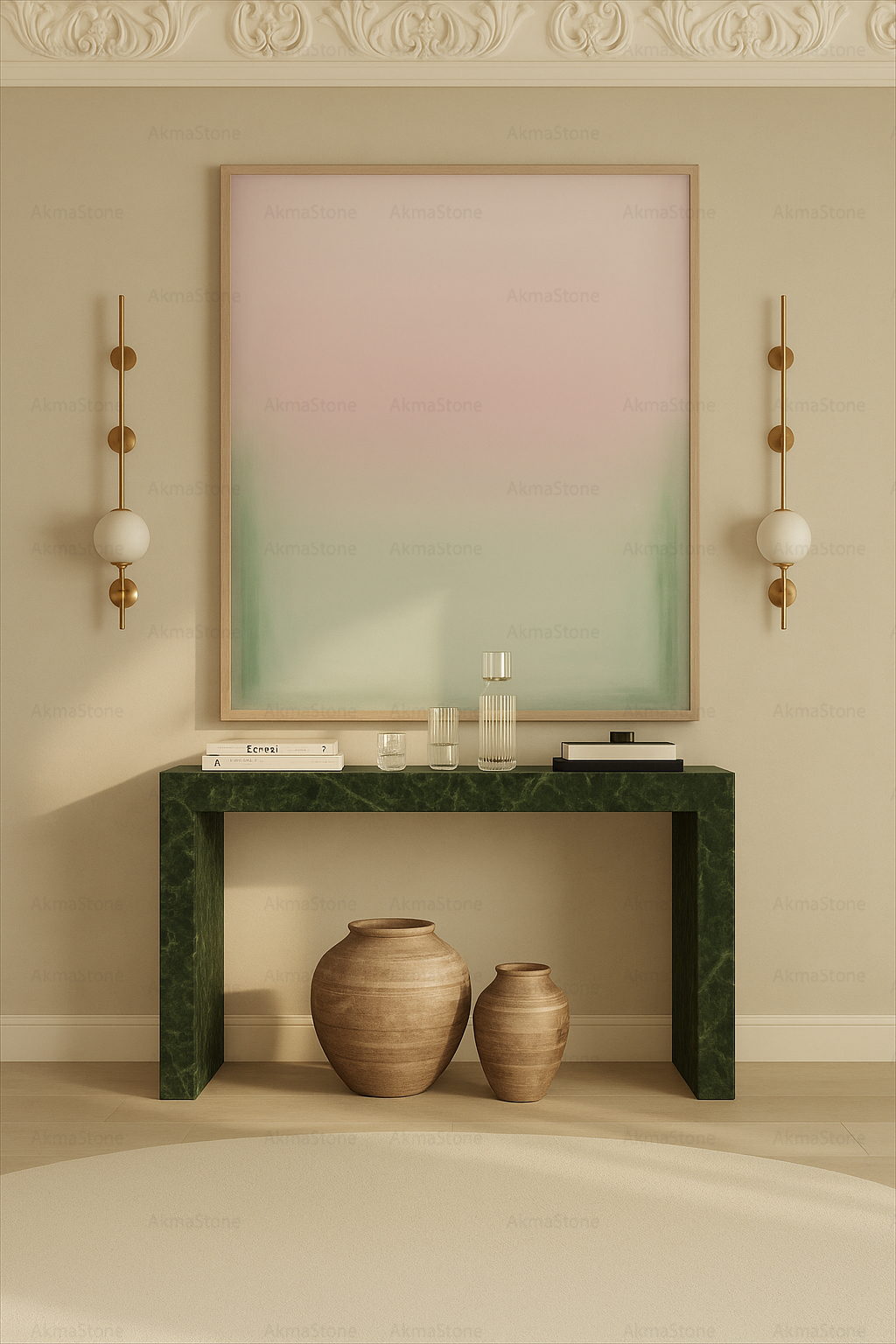 رخام منغ غرين بلونه الأخضر الغني وعروقه الناعمة، حجر طبيعي أنيق مثالي لتصاميم داخلية هادئة وفاخرة.